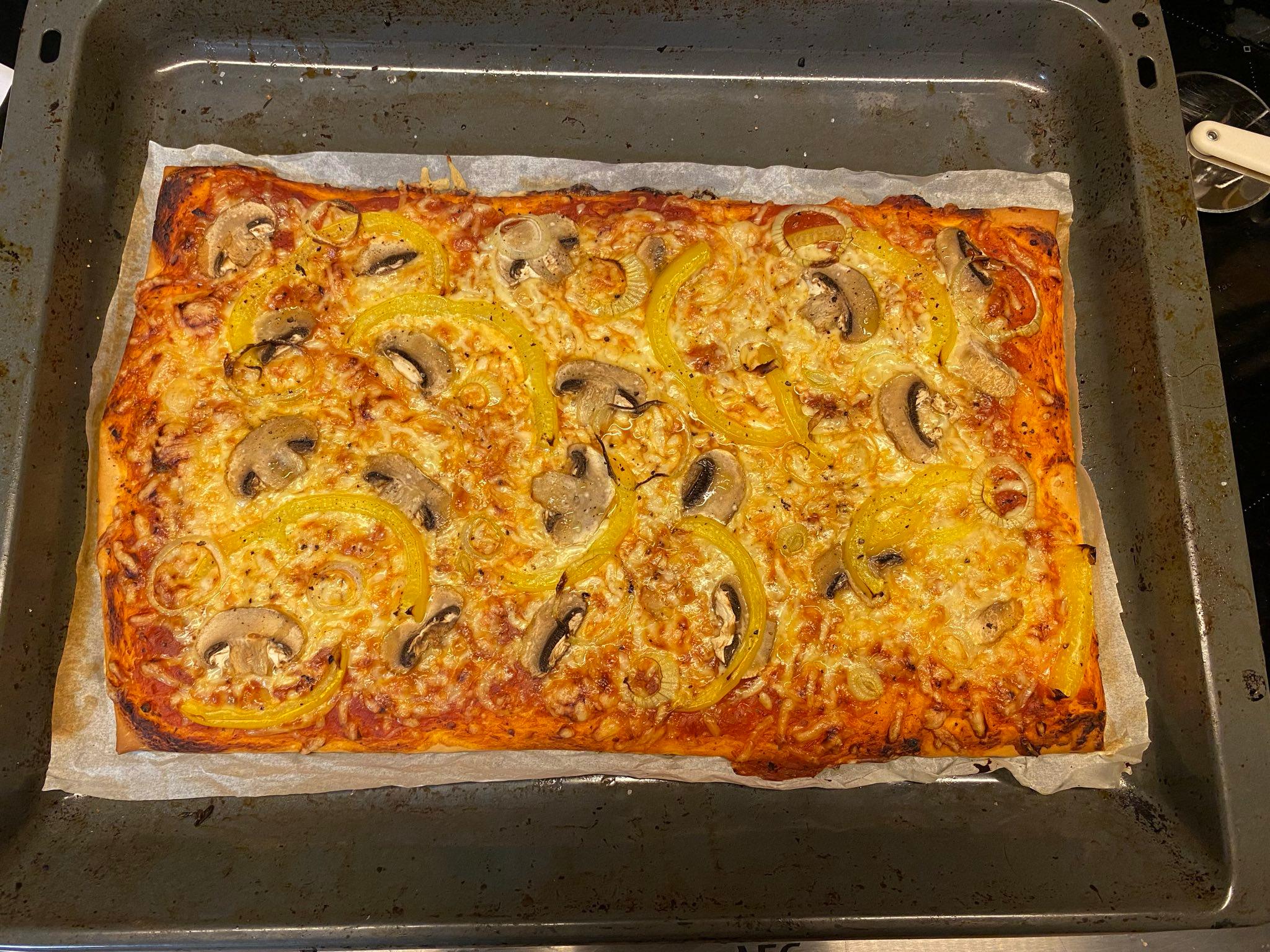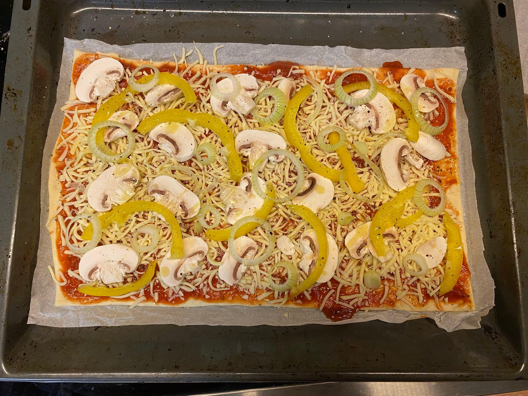 schnell für GruppenDie Pizza aus diesen fertigen “Pizza-Sets” von Rewe (ein aufgerollter Lappen Fertigteig und ein Glas Tomatensoße) ist jetzt nicht wirklich ein Rezept wert, aber ich will die Mengen und Preise hier dokumentieren - es bietet sich nämlich durchaus an, die in größeren Mengen zu backen, weil es schnell geht, relativ günstig ist und gut auf verschiedene Geschmäcker anpassbar. Wenn wir mal ehrlich sind, ist es eigentlich kaum schwieriger, Teig und Soße selbst zu machen, und das wird dann automatisch deutlich bessere Pizza als diese hier, also ist diese Option im Zweifel zu bevorzugen :)