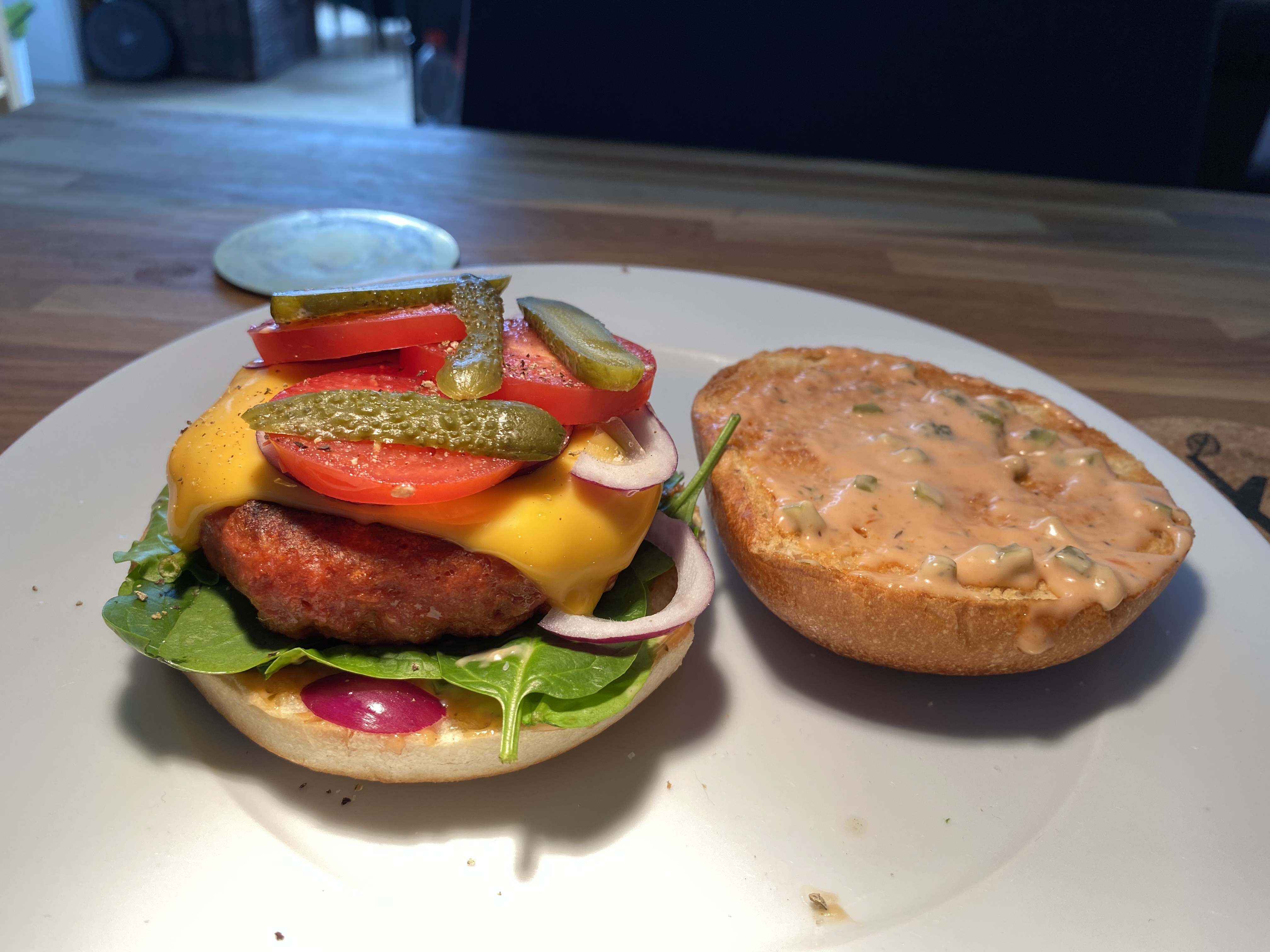 - Soße: entweder unkompliziert Ketchup/Mayo/Senf, vielleicht auch eine Mischung aus denen (fancy: fein gehackte Zwiebeln, Gürkchen oder Kräuter reinmischen) oder das Zeug was in der Flasche als “Burgersauce” z.B. von Heinz verkauft wird, eigentlich ziemlich lecker. Experimentieren könnte man mit fruchtigeren Soßen, die es fertig gibt (sowas wie Grillsauce Mango-Curry)