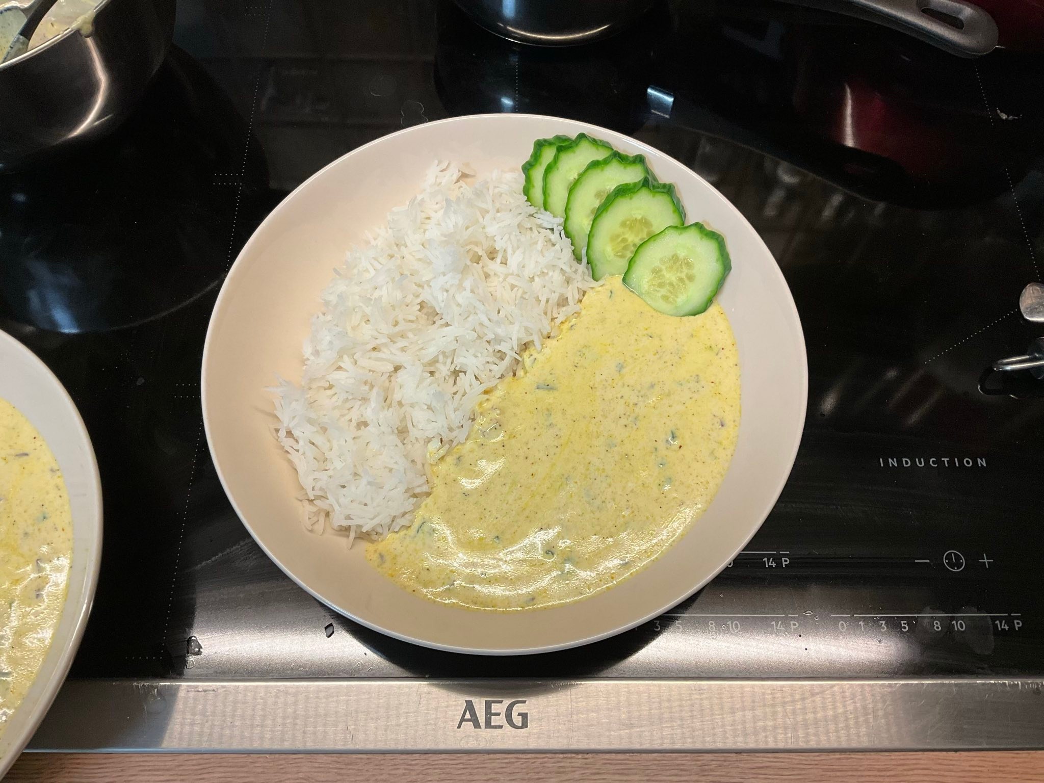 Umrühren, nochmal abschmecken, mit Gurken, Koriander und Chili garnieren und mit Roti oder Basmatireis servieren.